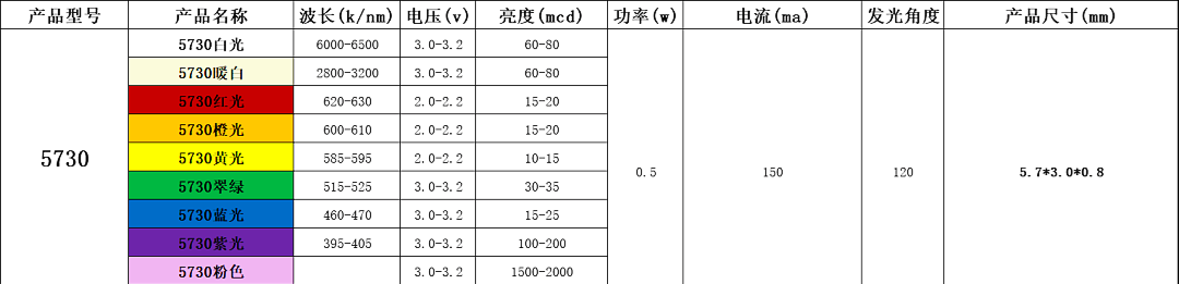 4、電流:5730燈珠0.5瓦電流150mA,電壓看具體的顏色.