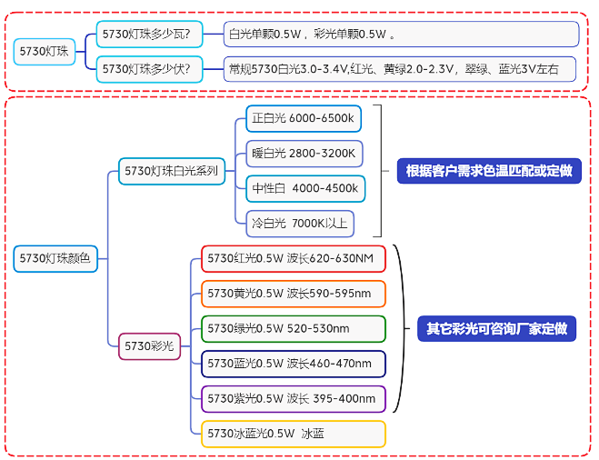 2、功率:5730燈珠單顆是多少瓦?0.5瓦或定制成1瓦.